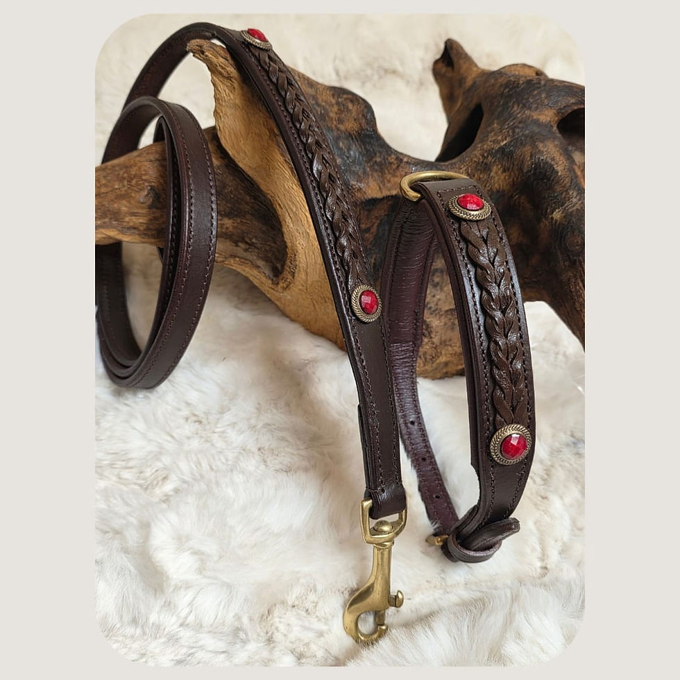 Black Braided Red Gem Collar Lead Set Premium Leather